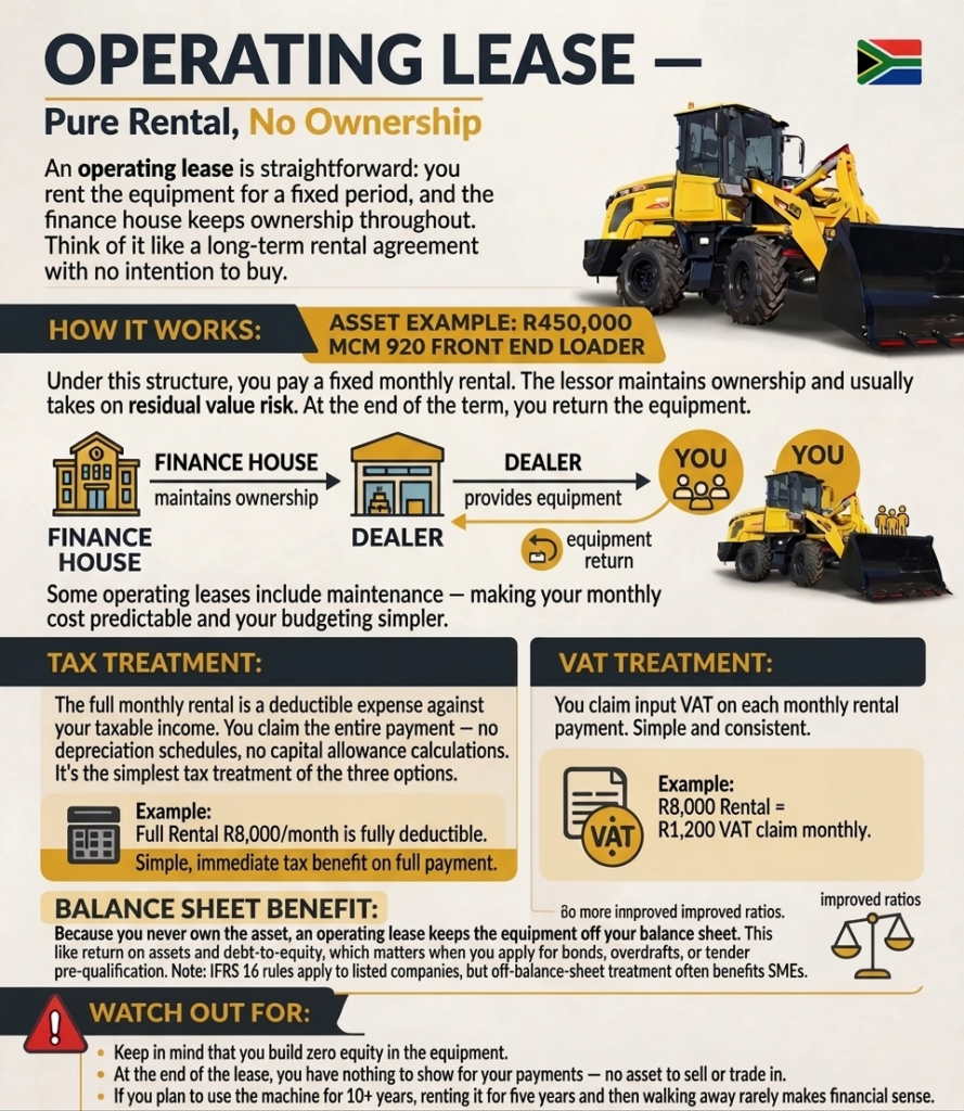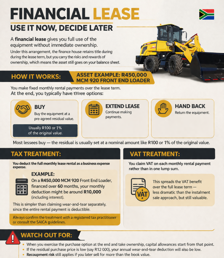 Tax treatment: Because of this, you deduct the full monthly lease rental as a business expense. Similarly, on our R450,000 MCM 920 Front End Loader, financed over 60 months, your monthly deduction might be around R10,000 (including interest). In practice, this is simpler than claiming wear-and-tear separately, since the entire rental payment is deductible. Above all, always confirm the treatment with a registered tax practitioner or consult the SAICA guidelines.