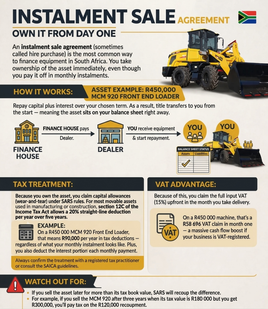 Tax treatment: Because you own the asset, you claim capital allowances (wear-and-tear) under SARS rules. For most movable assets used in manufacturing or construction, section 12C of the Income Tax Act allows a 20% straight-line deduction per year over five years. As a result, on a R450 000 MCM 920 Front End Loader, that means R90,000 per year in tax deductions — regardless of what your monthly instalment looks like. Plus, you also deduct the interest portion of each monthly payment.