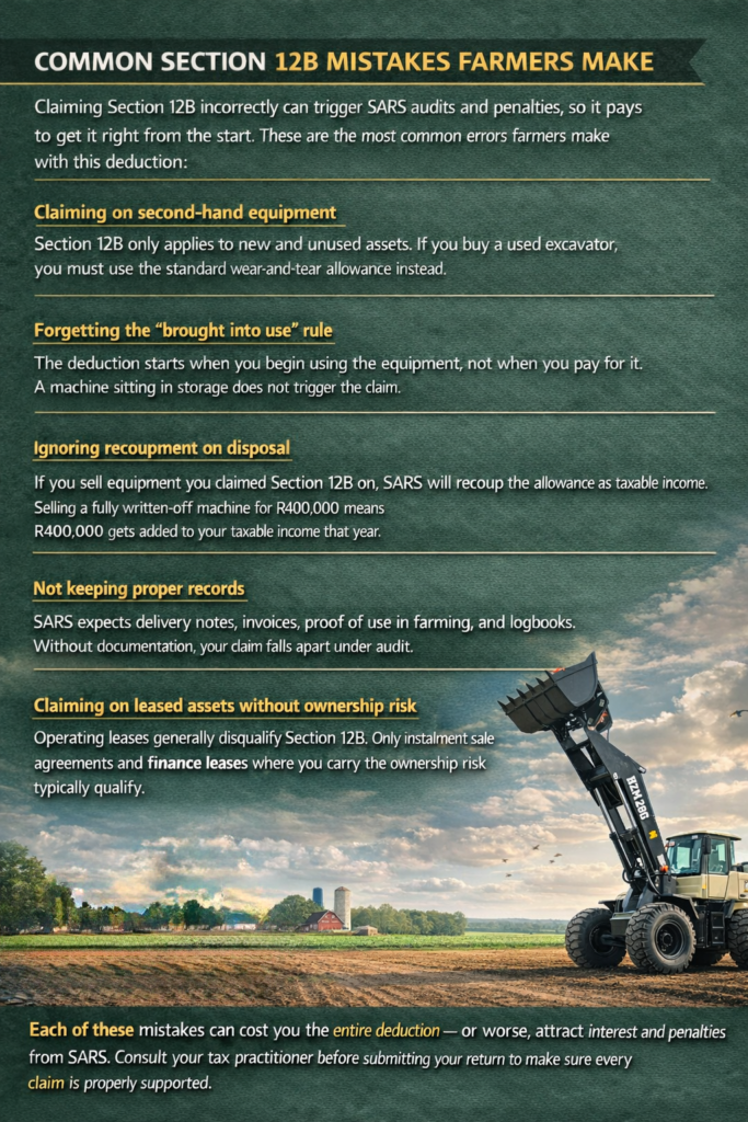 Claiming Section 12B incorrectly can trigger SARS audits and penalties, so it pays to get it right from the start. These are the most common errors farmers make with this deduction: