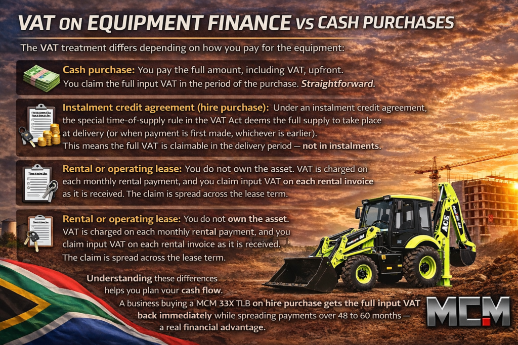 Understanding these differences helps you plan your cash flow. For example, a business buying a MCM 33X TLB on hire purchase gets the full input VAT back immediately, while spreading payments over 48 to 60 months.