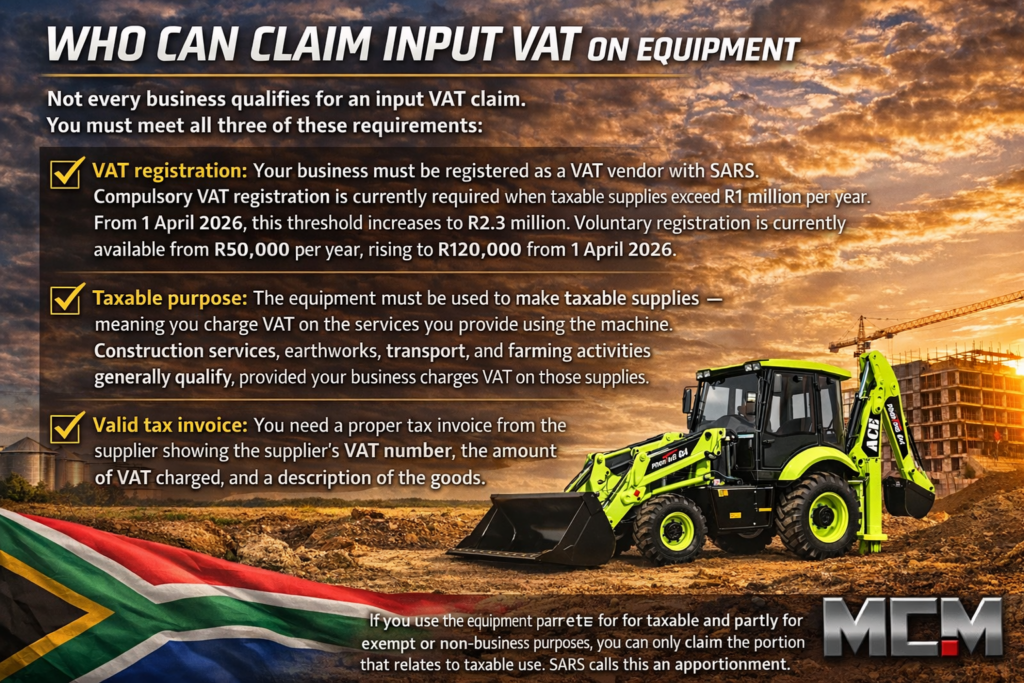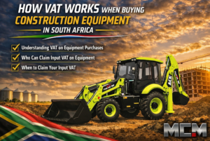 MCM Group supplies construction and agricultural equipment across South Africa — and understanding how VAT applies to your purchase can save your business tens of thousands of rands. Whether you buy a TLB, front end loader, or excavator, MCM branches in Cape Town, George, Gauteng, and Bloemfontein provide full tax invoices so you can claim your input VAT without hassle.